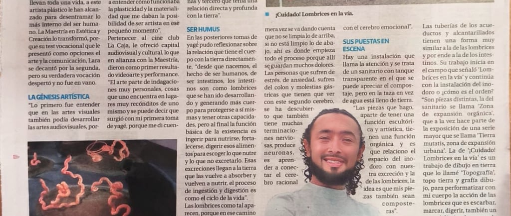 “Son piezas distintas. La del sanitario se llama Zona de expansión orgánica, que a la vez hace parte de la exposición de una serie mayor que se llama Terra mutatis, zona de expansión urbana orgánica. La de ¡Cuidado! Lombrices en la vía es un trabajo de dibujo en tierra que llamé Topografía (topo, tierra; y grafía, dibujo) para performatizar con mi cuerpo la acción de las lombrices, que es escarbar, marcar, digerir. También un poco delimitar las zonas de construcción urbana, que haya un espacio que no sea para residir, sino uno para habitar con función poética y artística.