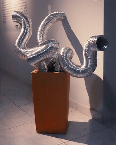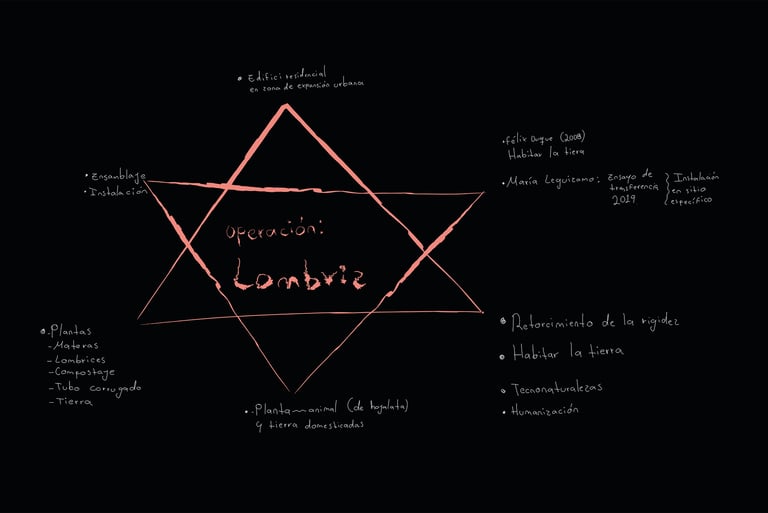 Se trata de una operación de ensamblaje que articula un tubo corrugado, una matera de cerámica y una porción de tierra. Estos tres materiales indican las relaciones que percibo entre: la construcción civil de edificios para vivir, trabajar y, en general, “habitar”, las lombrices de tierra representadas por medio de los tubos corrugados y la matera hecha de tierra para contener tierra y al mismo tiempo aislarla. Es una operación que reflexiona sobre la humanización de la tierra, las formas en que la habitamos y su domesticación.